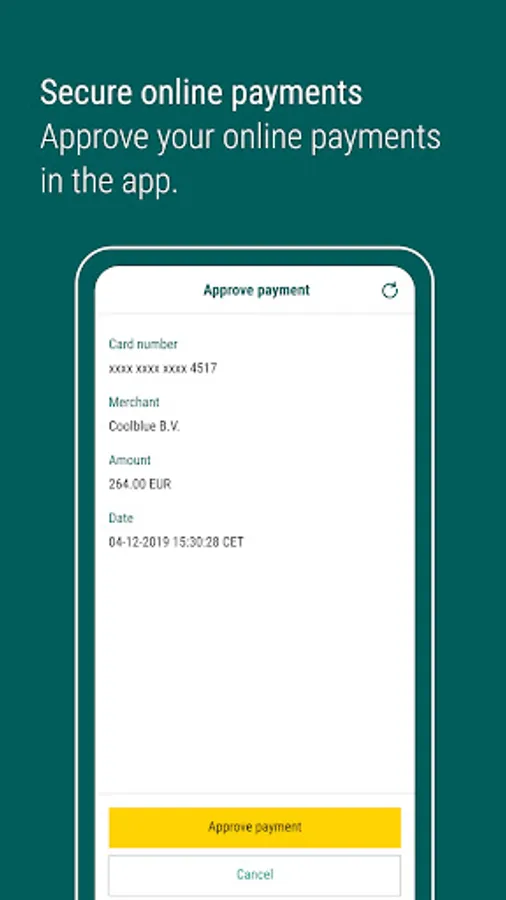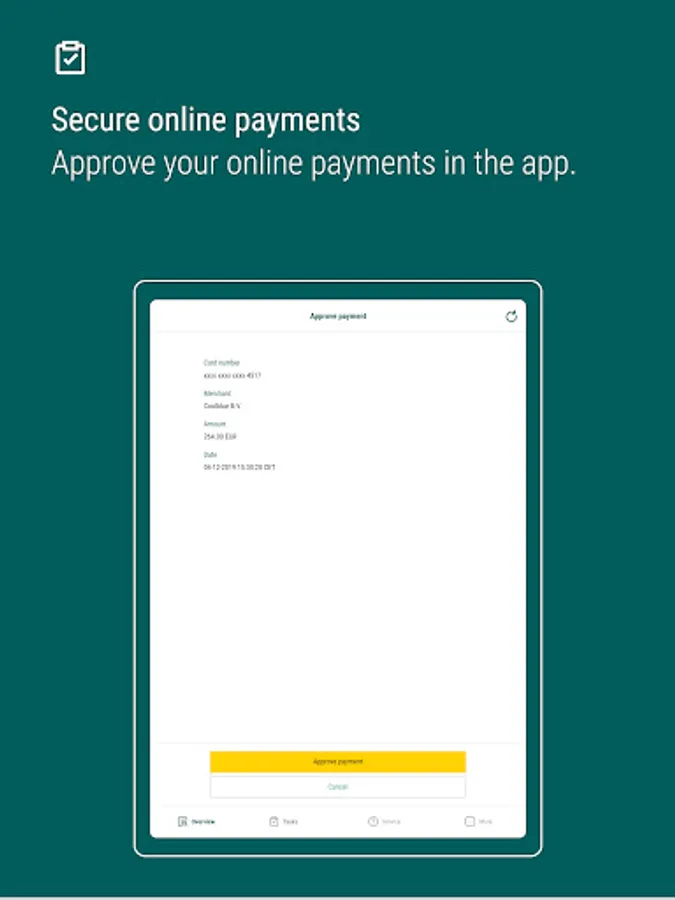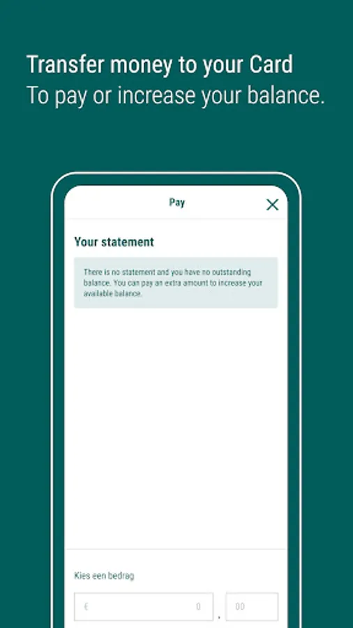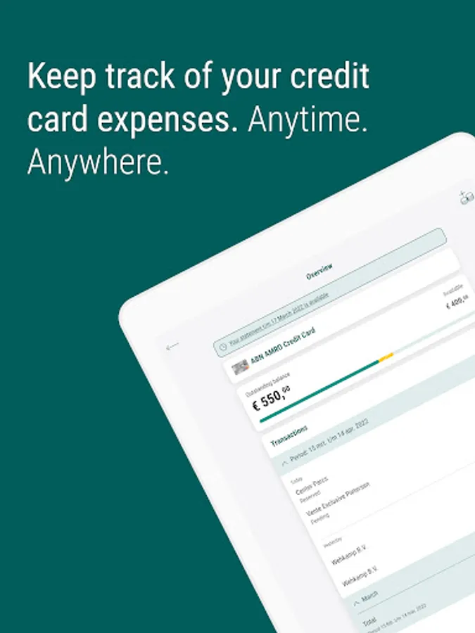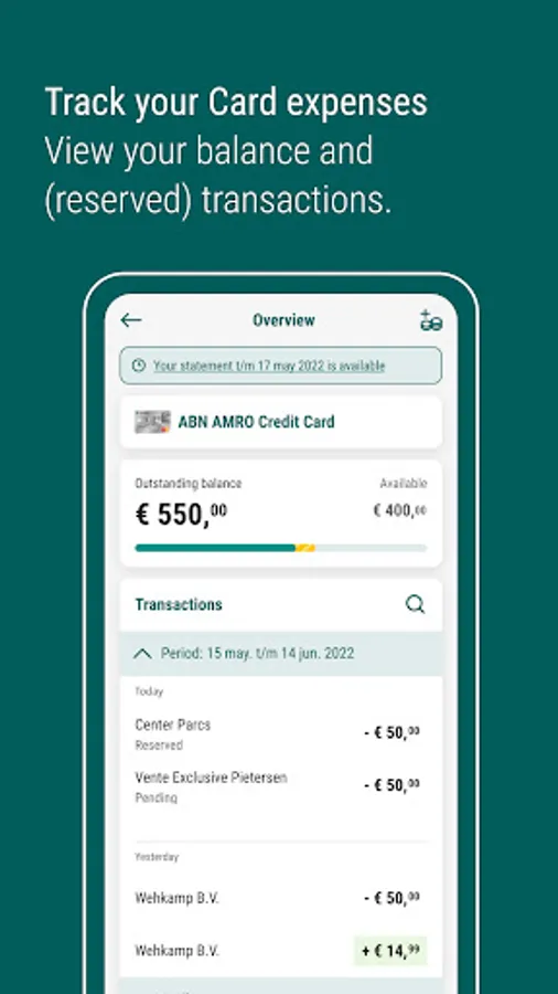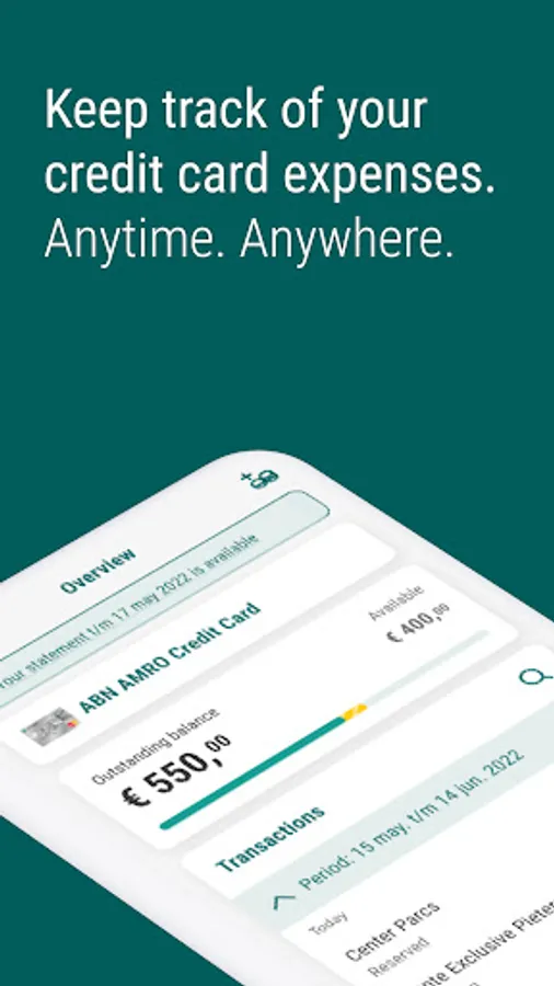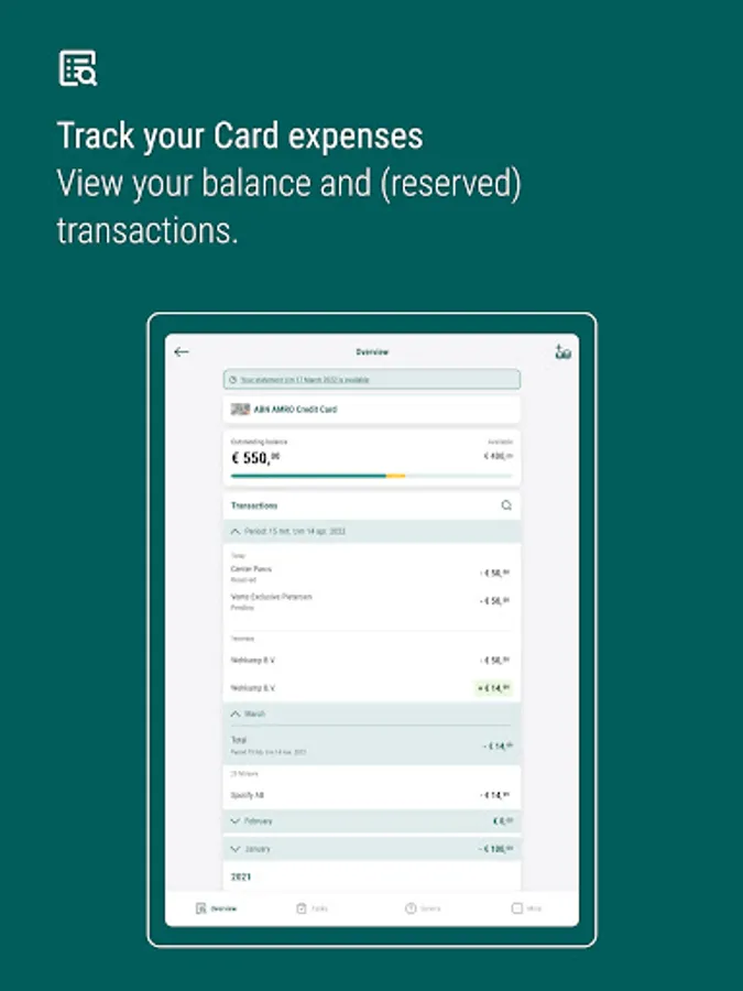 Keep track of your expenses wherever you are with the ABN AMRO Creditcard app. You’ll know what you have left to spend in an instant. Online payments become a breeze with facial recognition or fingerprint. Are you a few euros short on your next online order? No problem! Top up your Card quickly and easily via the app.
