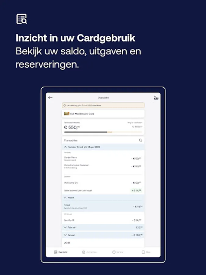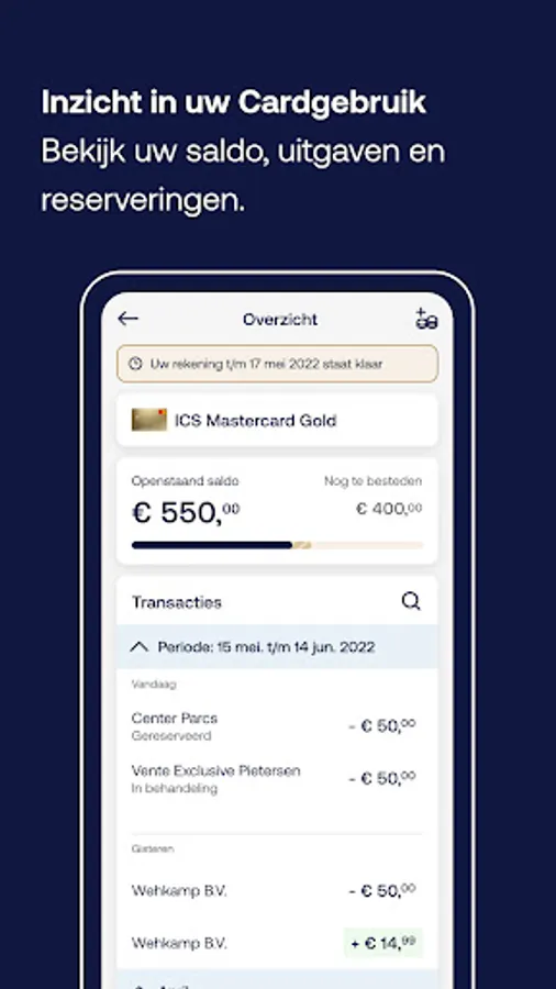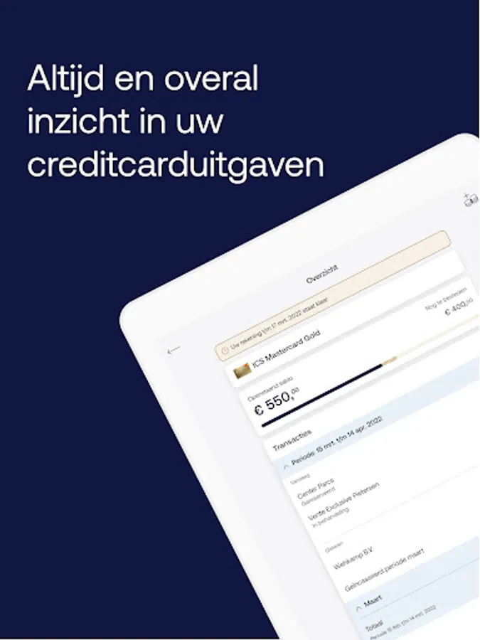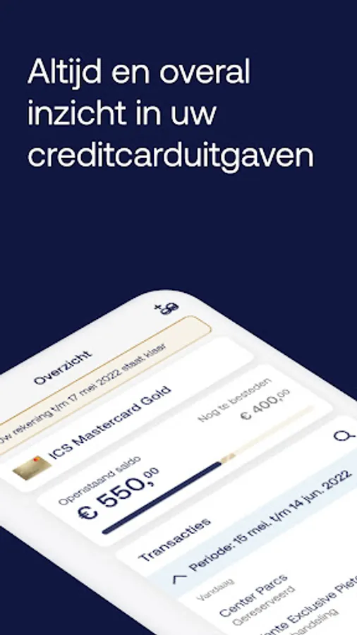 Keep track of your expenses wherever you are with the ICS Gold Creditcard app. You’ll know what you have left to spend in an instant. Online payments become a breeze with facial recognition or fingerprint. Are you a few euros short on your next online order? No problem! Top up your Card quickly and easily via the app.