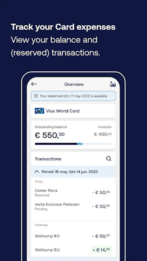 Keep track of your expenses wherever you are with the ICS Creditcard app. You’ll know what you have left to spend in an instant. Online payments become a breeze with facial recognition or fingerprint. Are you a few euros short on your next online order? No problem! Top up your Card quickly and easily via the app.