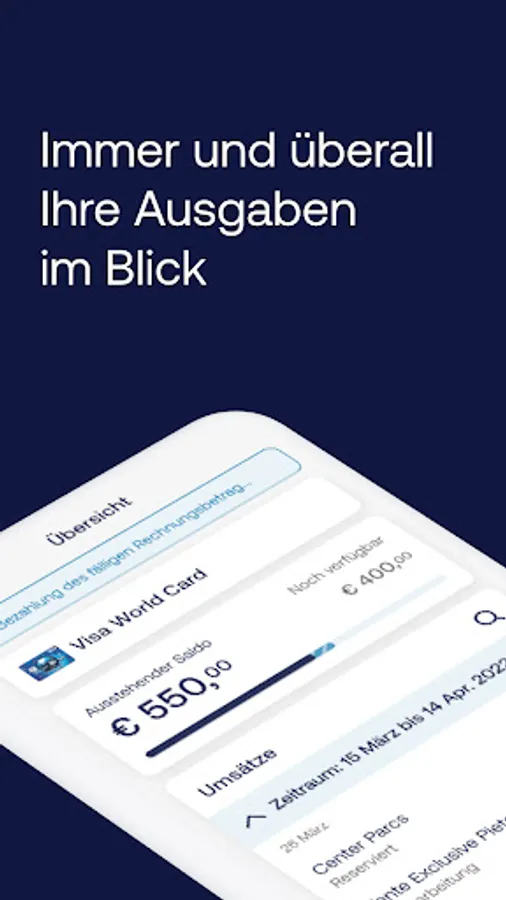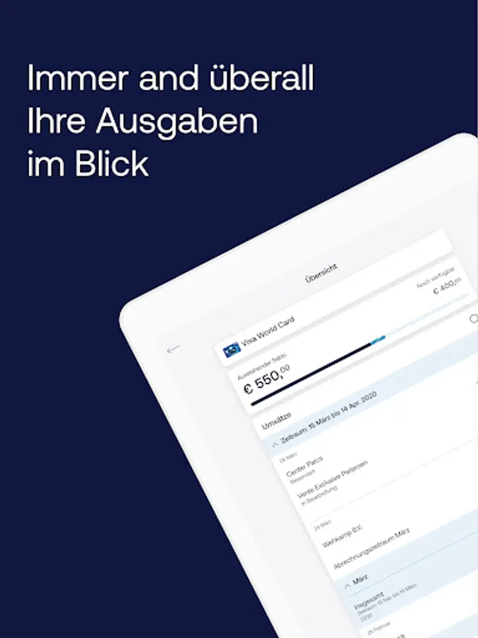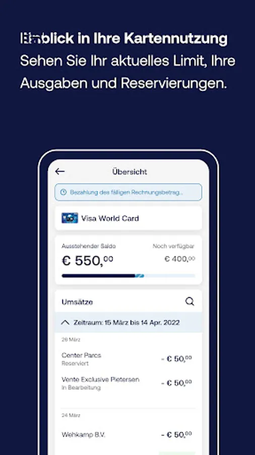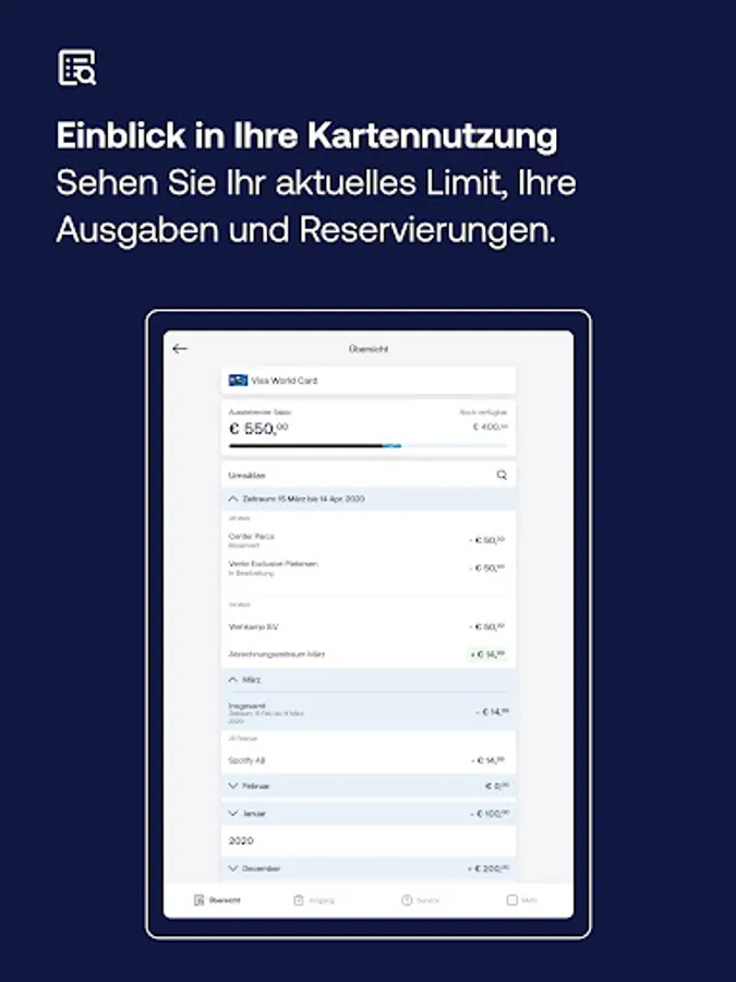 The overview in the ICS card app shows you quickly what you can still spend this month (spending limit). This way, you keep control of your credit card account.