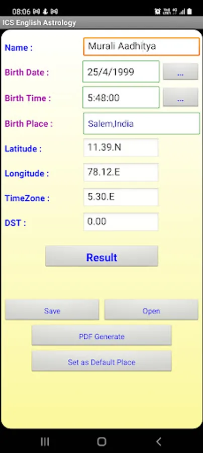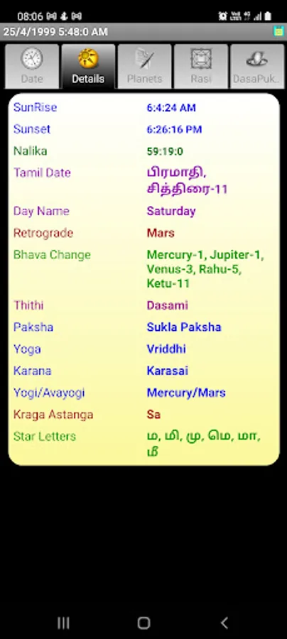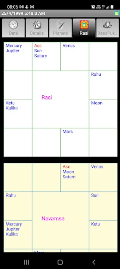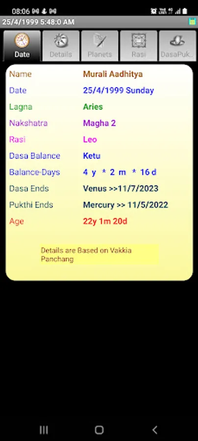 Horoscope calculated based on Vakkiam Panchangam in English Language. Based on Vakkiam Panchangam , all the details like Rasi, Navamsam, DasaVargam, Asta Vargam, Dasa Bukthi details are provided in English.