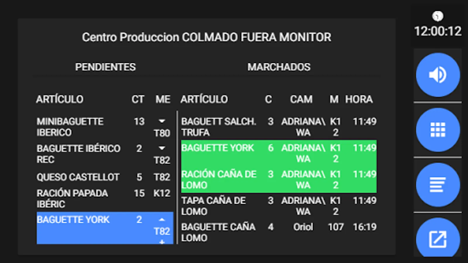 - Display of the open tables.