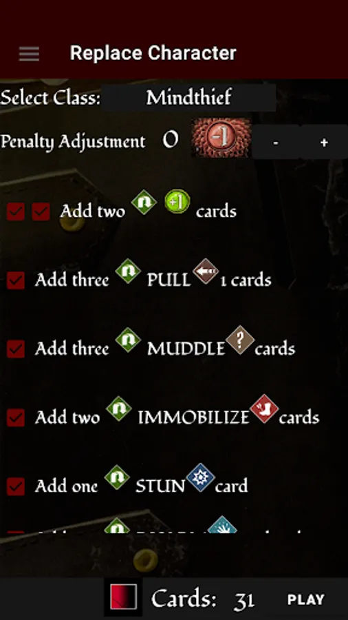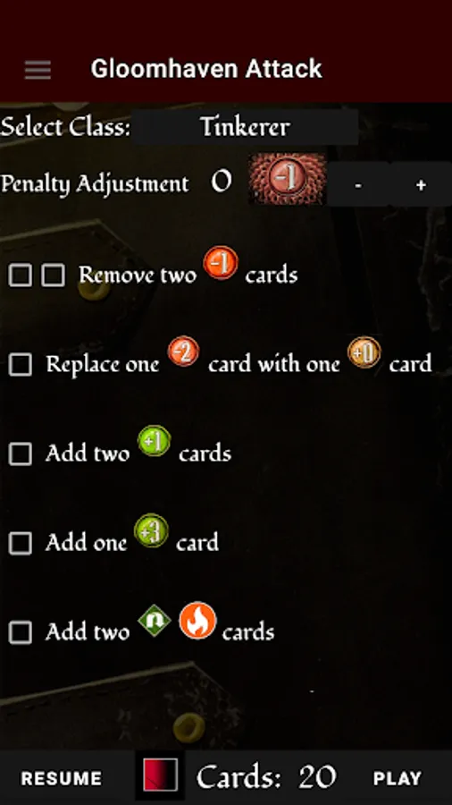 This spoiler-free application is intended for players to use instead of the attack modifier deck and also allows the player to customise their deck as they wish. During game play the player can add curses/blessings and also keep track of their character using trackers for status effects, battle goals, health, and experience. In addition, the application also includes a handy reminder to shuffle once a crit or null card is drawn.
