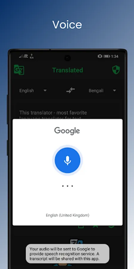 - Translate may ask for Microphone permission to access speech translation feature.