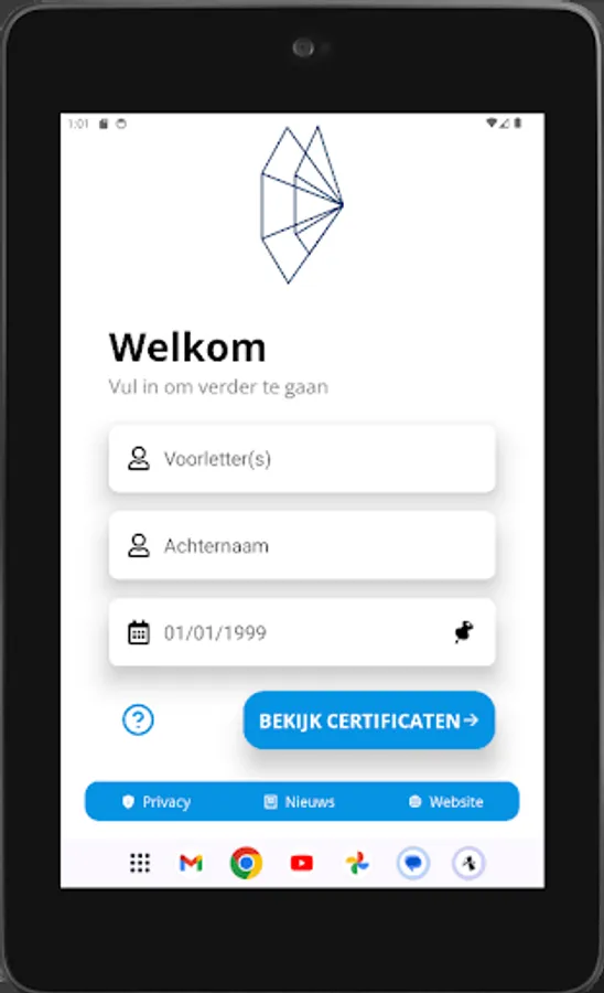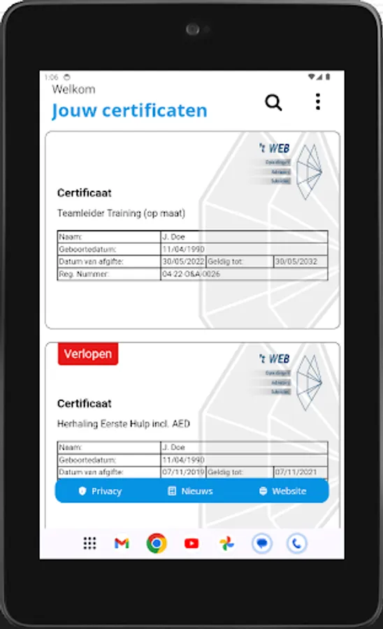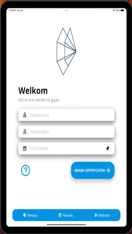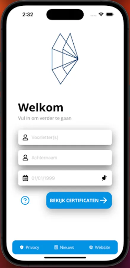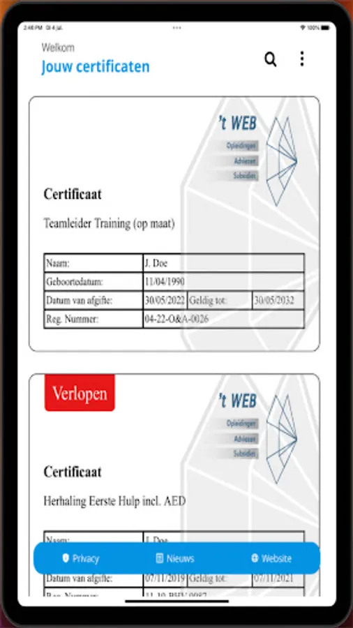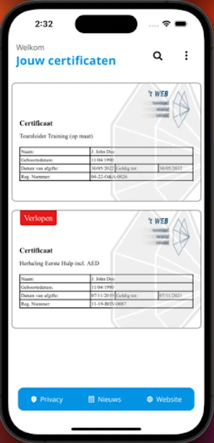 As soon as you start the application you will be taken to the start page. Enter your details here and press "search certificates". If you have obtained certificates at 't WEB, these will then be displayed on the screen. In addition, you can also view the latest news from the WEB with this app, so that you are always aware of the latest developments.