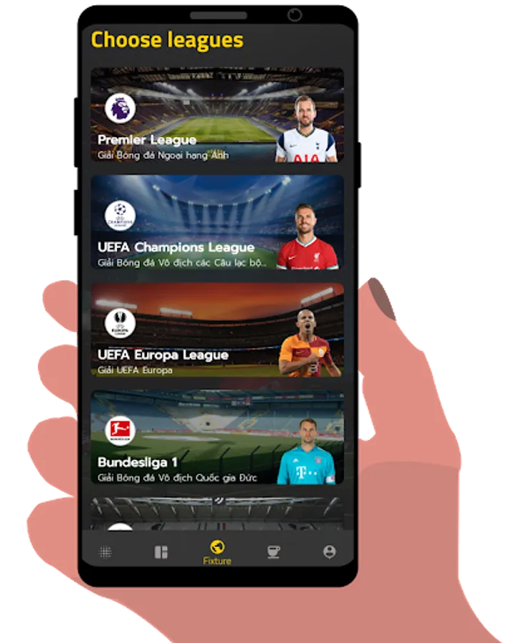 Theo dõi các trận đấu hấp dẫn nhất bao gồm cả các giải đấu bóng đá lớn như: V-League, UEFA Champions League, Ngoại Hạng Anh, La Liga Tây Ban Nha và hơn thế nữa.