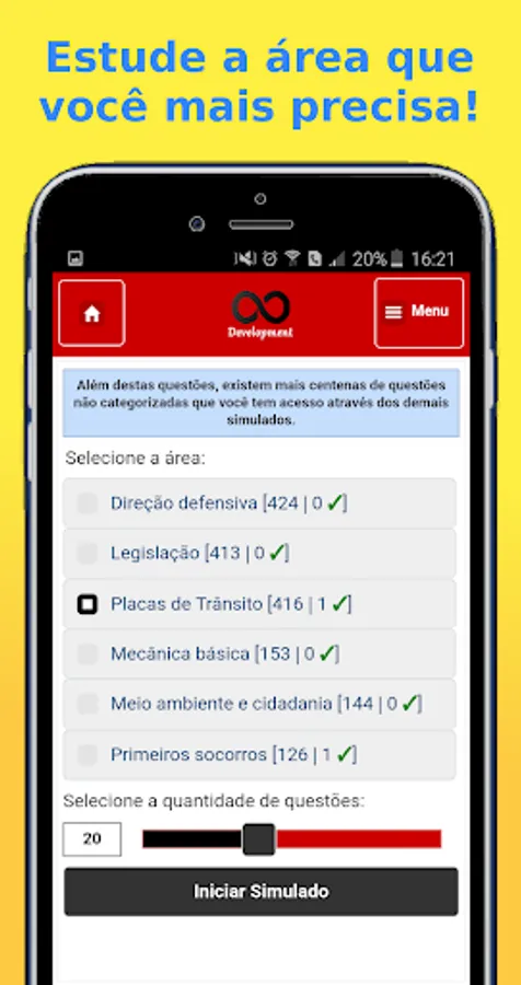 The topics covered by the DETRAN test for obtaining a CNH are listed below, and you can create custom simulations, covering some or all areas: