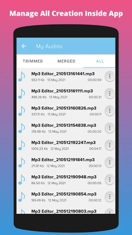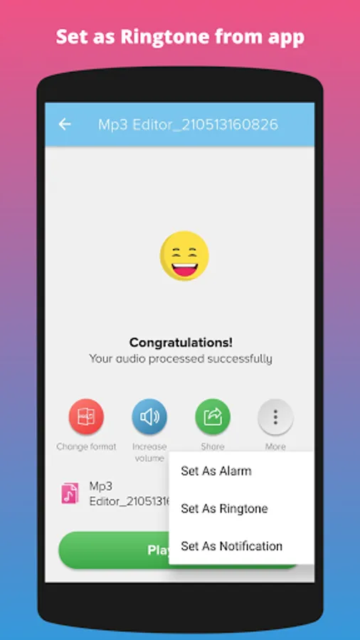 Ringtone Maker lets you personalize your phone with custom ringtones, alarms, and notification sounds. Easily set your favorite MP3 cuts as your ringtone and make sure you never miss a call again. MP3 Cutter & Audio Trimmer is the ultimate ringtone maker. Sharing your audio files with friends and family has never been simpler. Share directly from the app and let others appreciate your creations. Spread the joy of music effortlessly with MP3 Cutter and Merger!