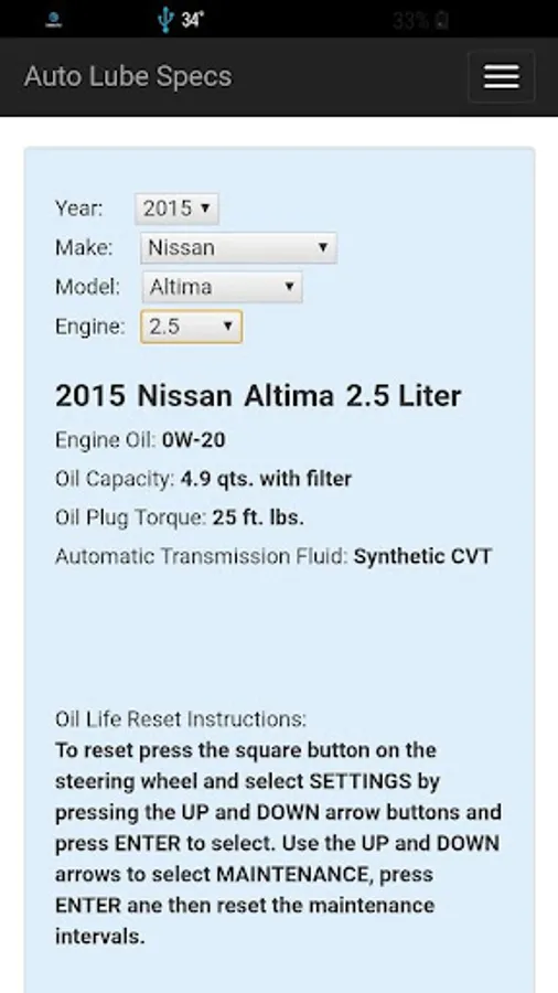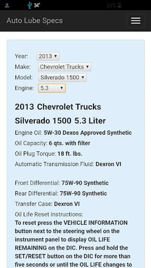 Auto Lube Specs contains lubrication specifications for almost the last 20 years, and will continue to add years and vehicles for user convenience. This app contains oil capacity, oil weight, drain plug torques, transmission fluids, differential fluids, transfer case fluids, oil maintenance light reset instructions, and wheel torques.