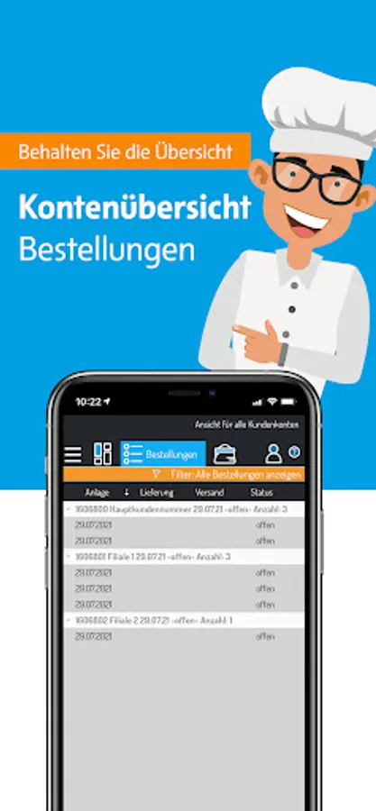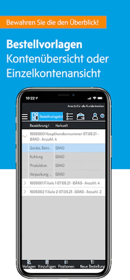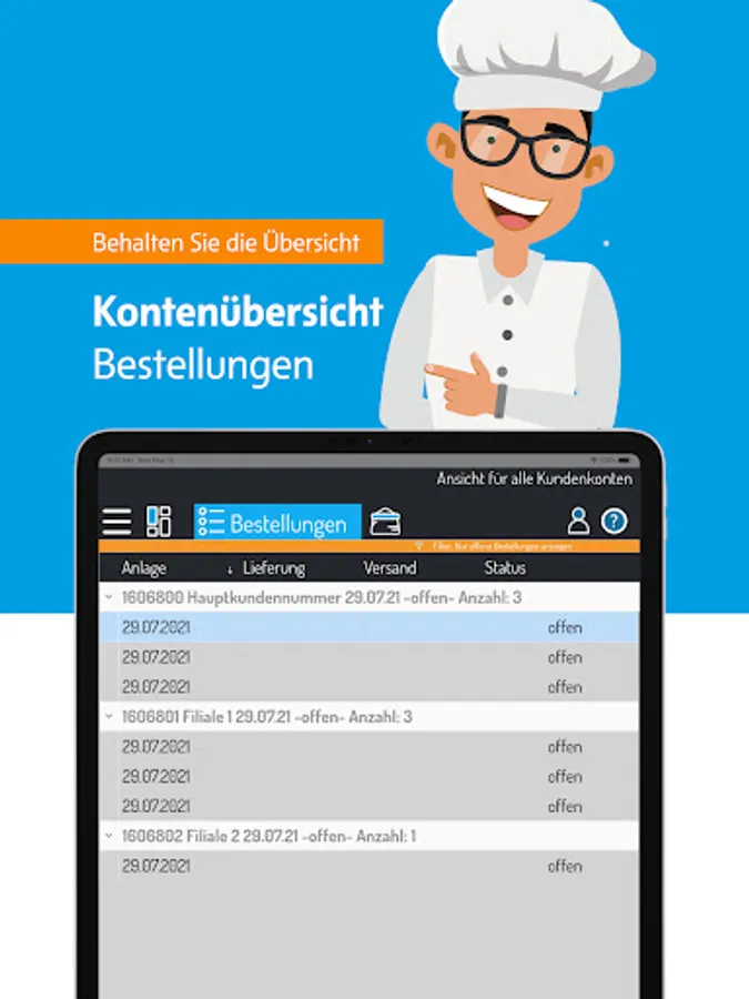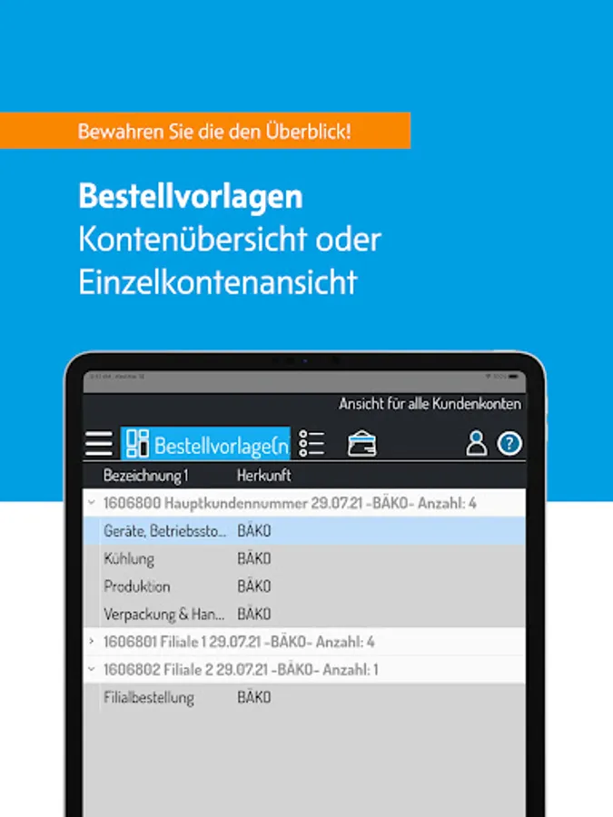 The orders and order templates managed in BackBüro® mobile ordering can now be displayed in an individual account view or in an account overview.
