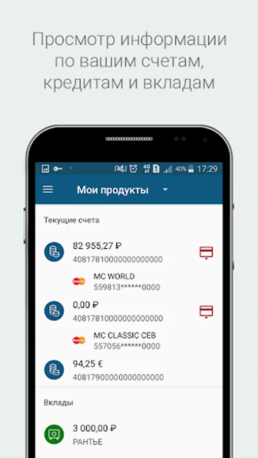 • Card products operations: replenishment, transaction history, expense analysis, cash back, bonus points, card re-issue, viewing full card details, managing card limits and much more