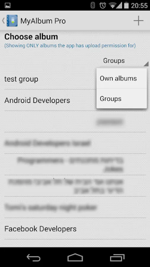 NOTE TO ALL USERS: If you set the app visibility in Facebook to be lower than public it WILL effect the albums list the app can upload to. To ensure the app will be able to upload to any album, set the app visibility to public.