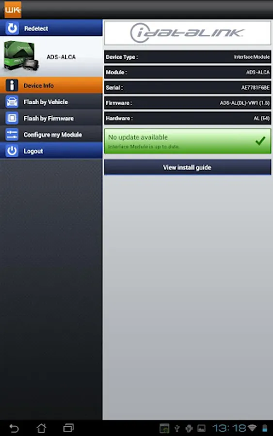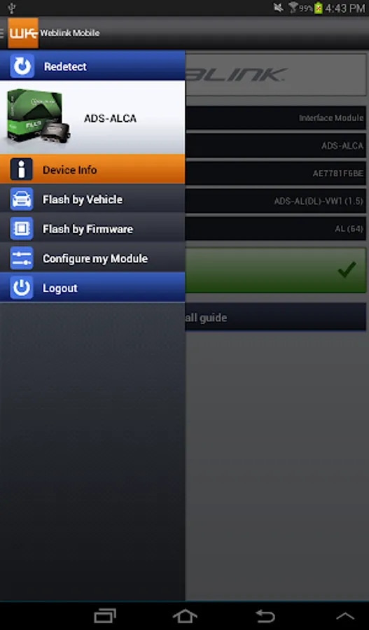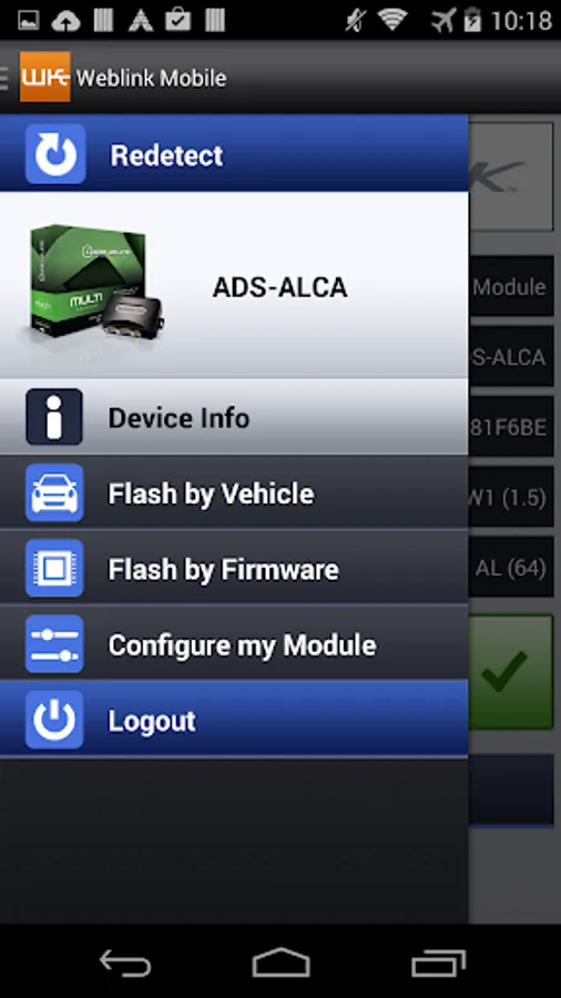 The Weblink Mobile app lets Authorized Installers program select iDatalink, iDatastart, Flashlogic, Omegalink, CompuStar, AKX and OrbitPro products, via their Android device. The Weblink Mobile app works in conjunction with the Weblink Mobile adapter cable (ADS-WLM-AN1 or FLWLMAN1 or OL-WLM-AN1) sold separately. An online Weblink account is also required.