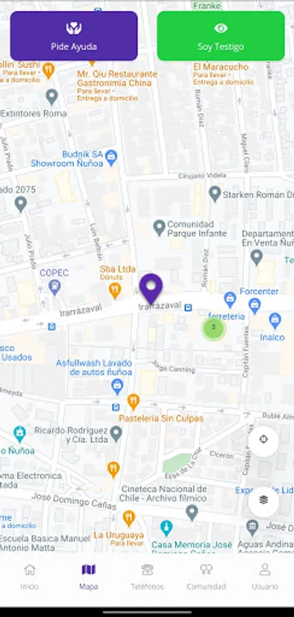 Within the application they will be able to alert with a point on the map about a situation of gender violence. If you are the one who needs help, you will have the "Ask for help" button, and if you are a witness you will have the "You are a Witness" button.