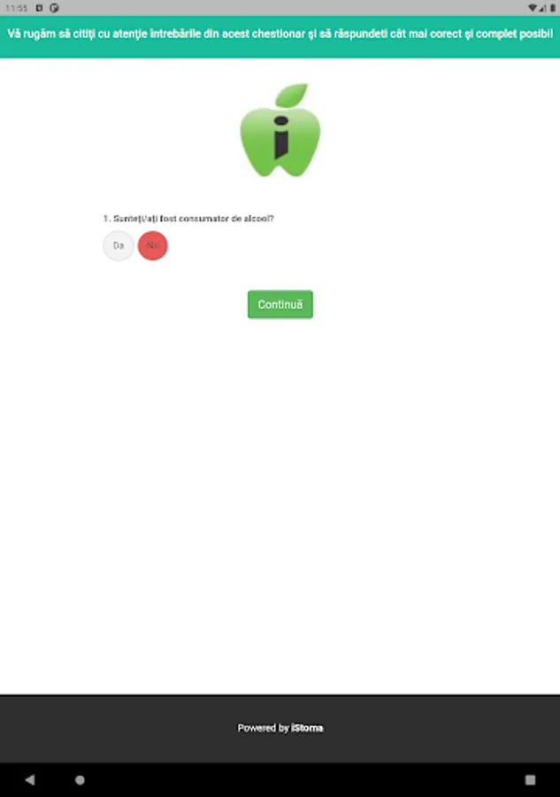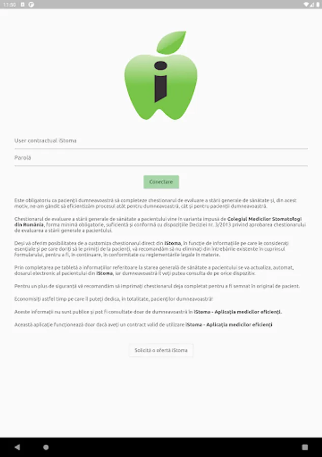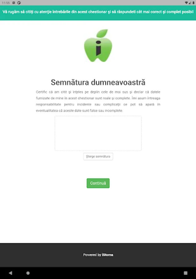 The questionnaire for assessing the general health of the patient comes in the version imposed by the Romanian College of Dentists, the minimum mandatory form, sufficient and in accordance with the provisions of Decision no. 3/2013 regarding the approval of the questionnaire for evaluating the general condition of the patient.