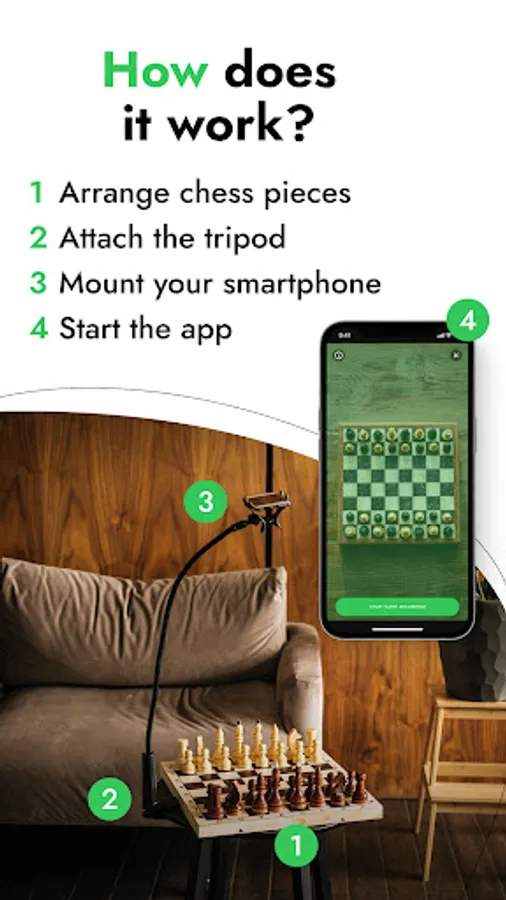 To record games, you only need a smartphone with the idChess app installed and a tripod to mount the smartphone above the board.