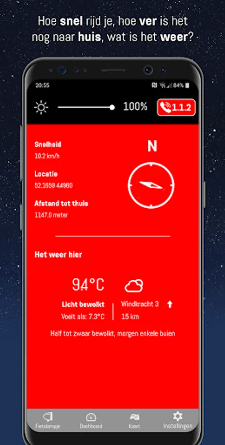 In the dashboard you can see how far away you are from home, how fast you cycle and what the weather is and will be. That's easy!
