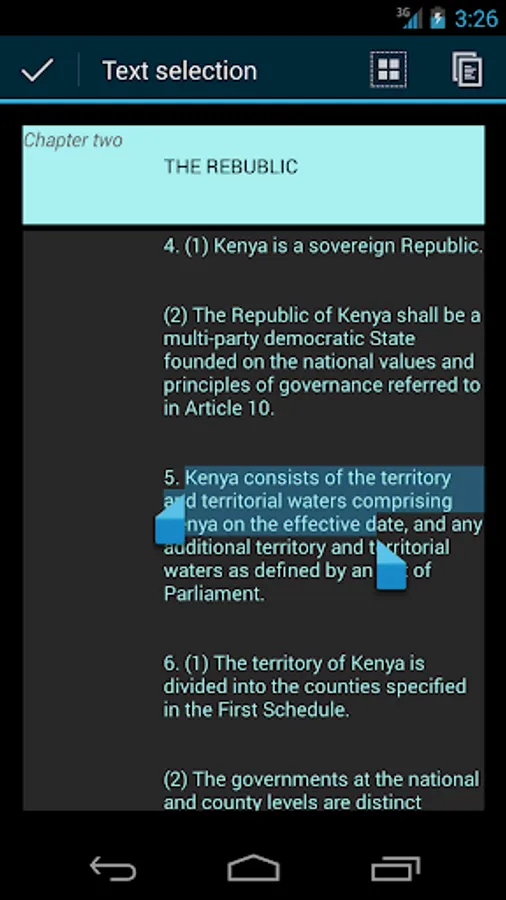 The Kenyan Constitution is an offline reference of the constitution of Kenya with beautiful alignment of content and very well built interface that simulates smooth and easy navigation. It features search, for all the articles enabling fast content retrieval and convenience. It touches on every detail that is documented on the 2010 Kenyan constitution to the letter, and in a very elegant way.