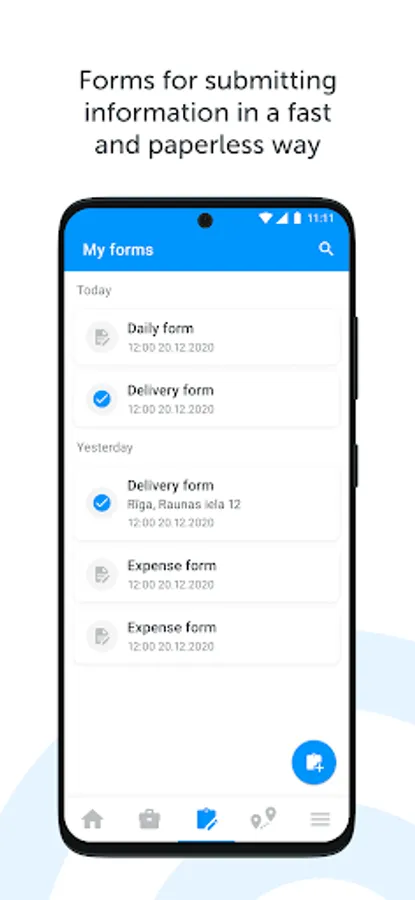 Forms - everyday paper forms such as delivery forms, expense forms, inventory forms and even accident report forms, now available digitally for around-the-clock access and instant submission. Created and customized by managers, acquiring only the most essential data and allows for immediate processing;