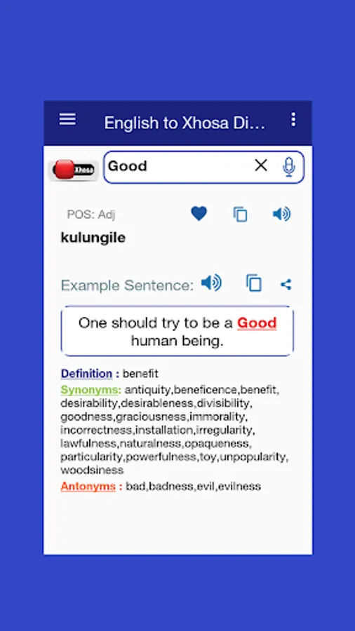 English to Xhosa and Xhosa to English offline dictionary. Also show available meaningful picture with word meaning. User-friendly interface and easy searching system.