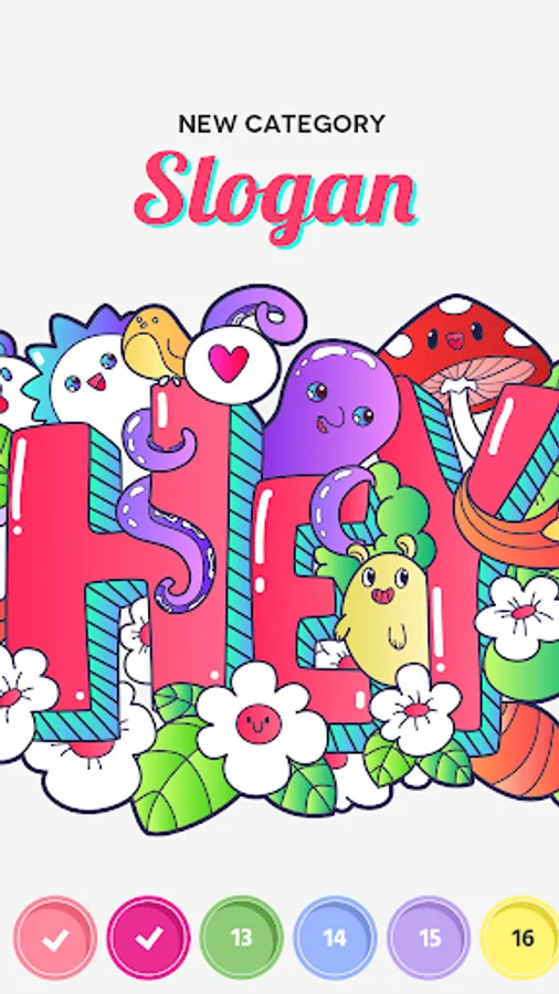 💛 Great variety of coloring pages in different categories for color by number:😊 People, for kids, animal🐼, cartoon🐱, mandala🌟, flower, places🏰, slogan, world in bottle, fashion💎, unicorn🎠.