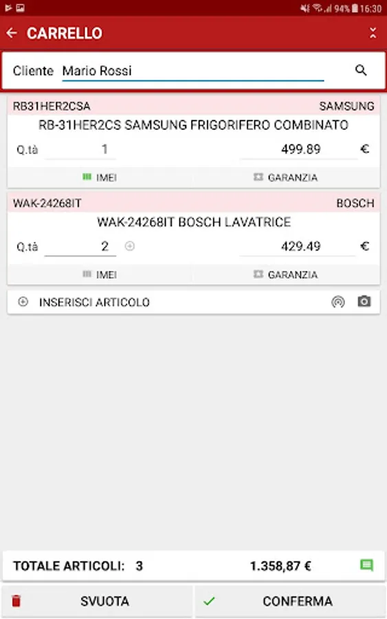 • Possibility to insert the articles in a commission registered to the client, with IMEI management, discounts and guarantees.