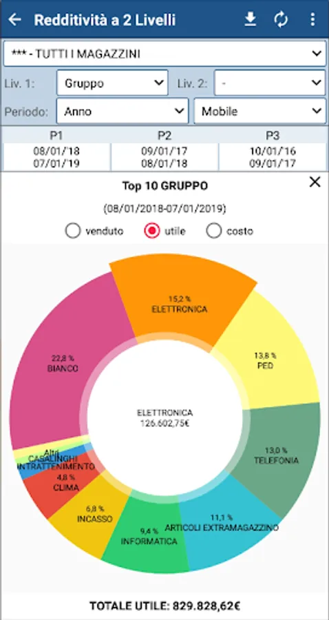 • Profitability grouped by one or two levels, with the possibility of selecting levels and comparing mobile, fixed weeks, months and years