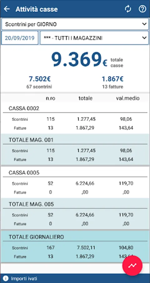 • Activity of the cash desks with indication of receipts and invoices, total sum and average value of the day, as well as the receipts by time slot
