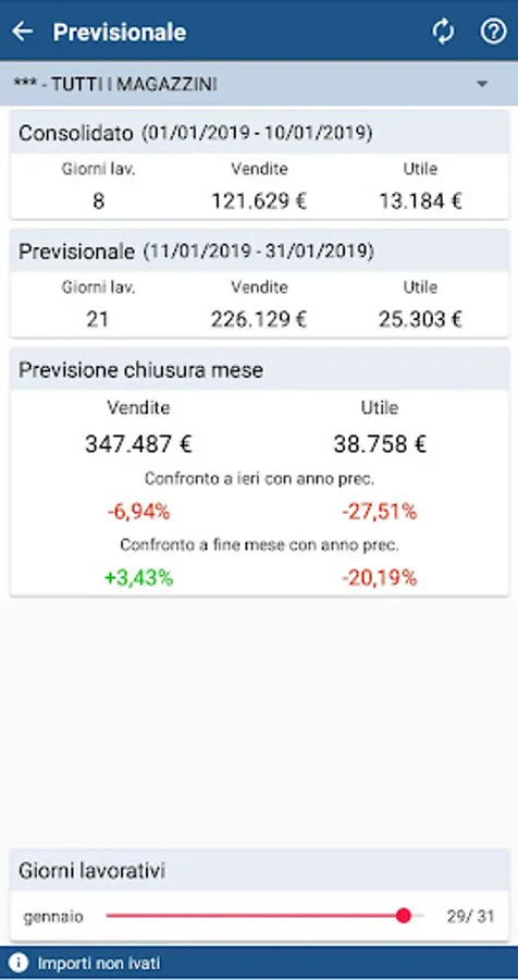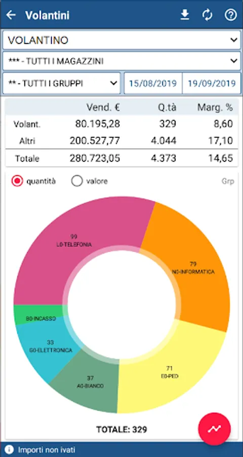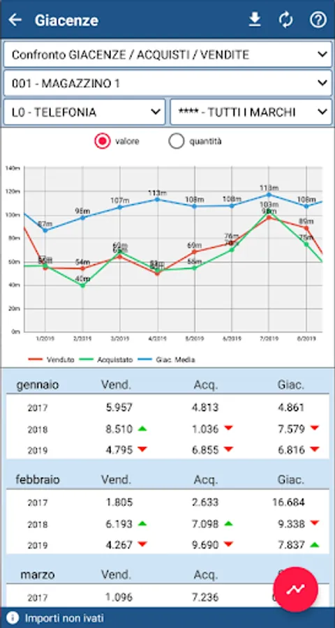 • Average stocks and stocks, filterable by group and brand, with the possibility of comparing the stock with purchased and sold month by month