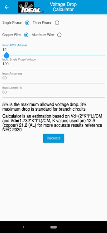 Voltage Drop Calculator – input wire size, voltage, amperage and length to determine volts and drop percentage.