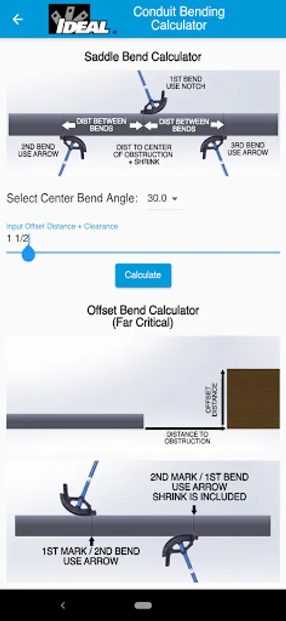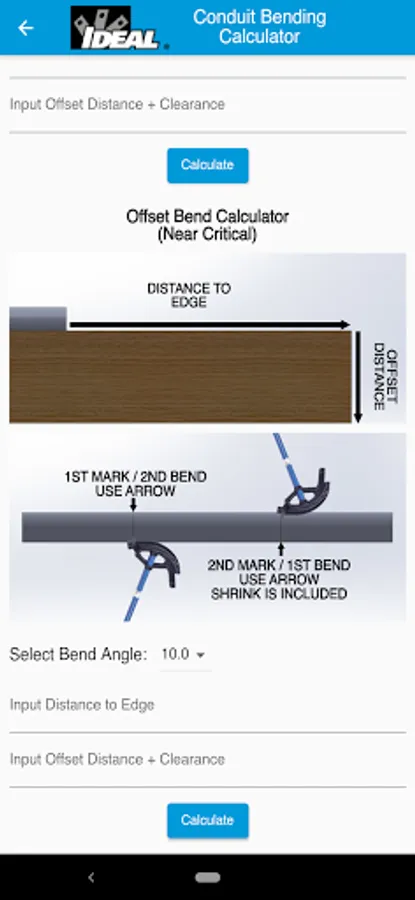 Conduit Bending Calculator – enter angle, offset distance and clearance to quickly calculate the required bend.