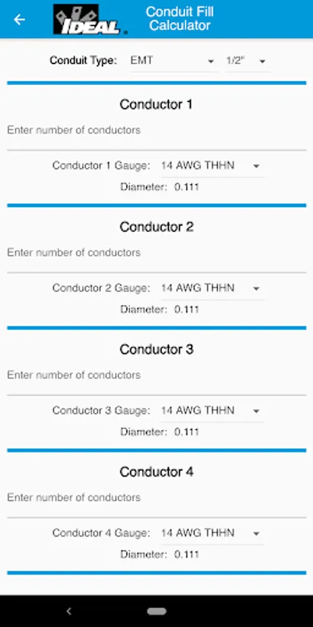 Conduit Fill Calculator – enter conduit type, size, and up to 4 unique wire combinations to quickly calculate conduit fill