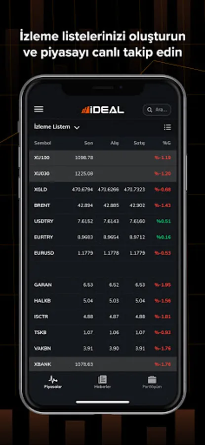 Ideal Mobil is a data platform that allows you to follow live data on domestic and international stock exchanges, easily access special news about markets and companies, and make all your market transactions more practically.