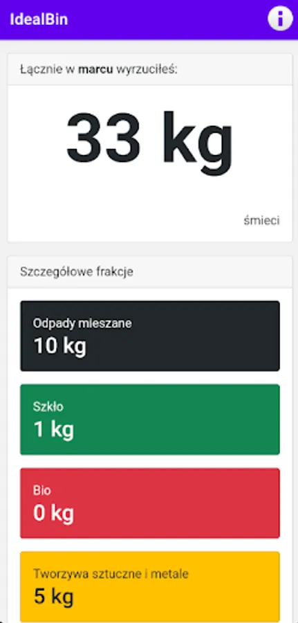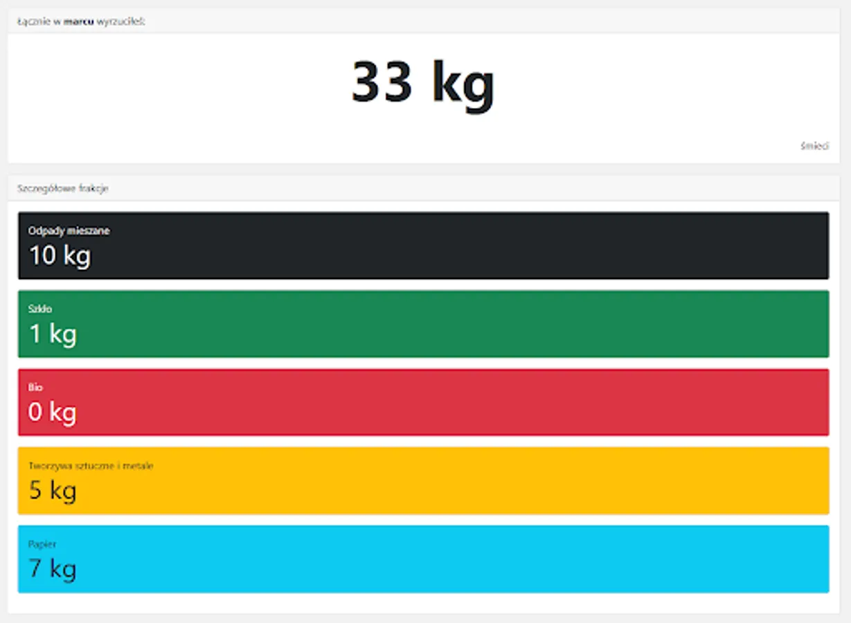 The application allows you to manage your waste. It shows the necessary information on the amount of thrown garbage and statistics for our baskets.