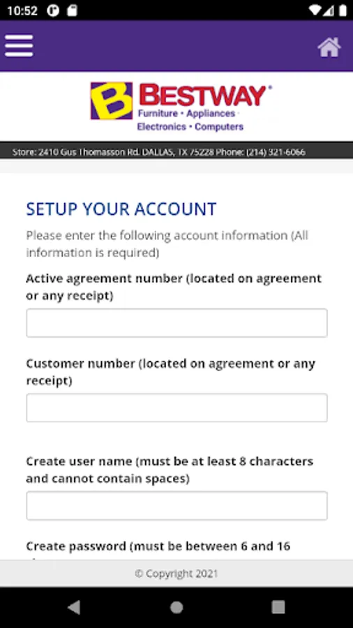 Once you select this link you will be asked to create a user name and password to link this app to your active Bestway account. You will need both you Customer Number and Agreement number which are located on your rental agreement you signed with Bestway. You can also call your local Best Way store and they can supply this information for you