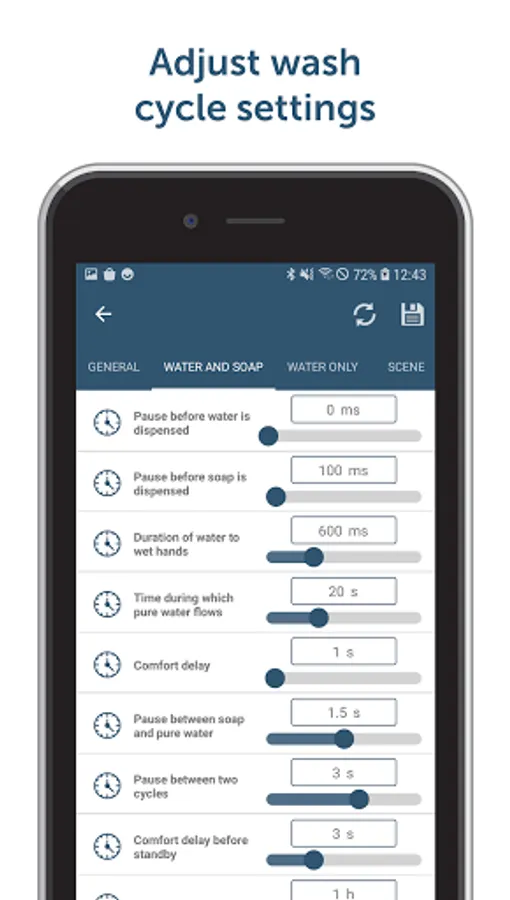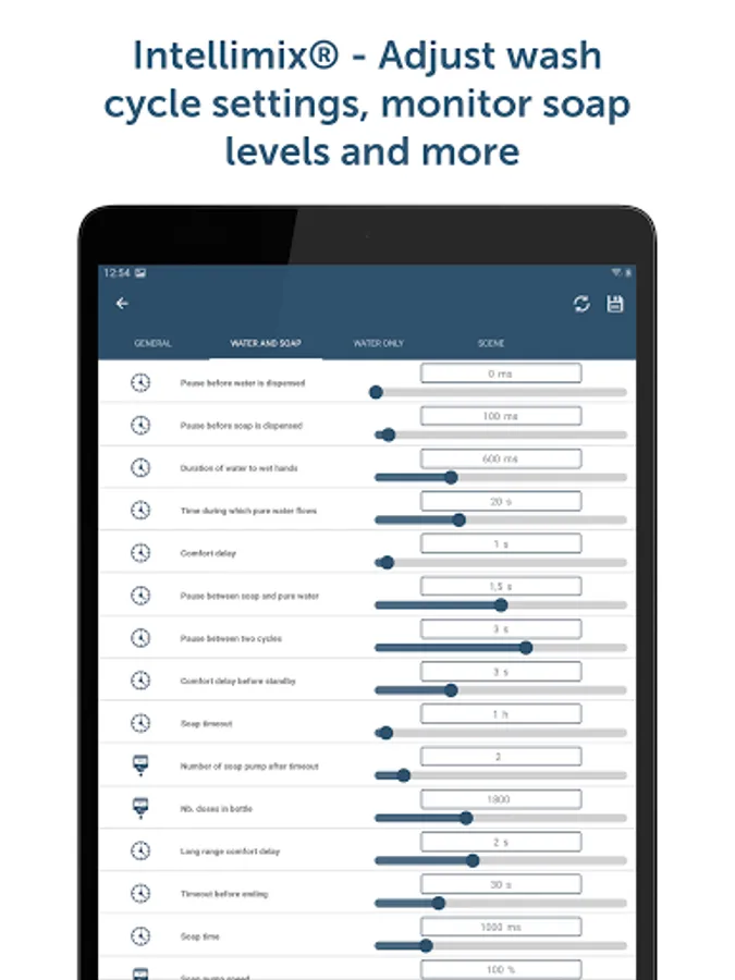 This application allows you to conveniently operate your Intellimix® soap integrated sensor taps via mobile phone or tablet. The app allows users to personalise their displays, monitor usage and soap levels, adjust wash cycle settings, switch to cleaning mode and much more.