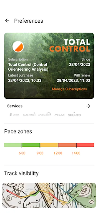 Control is an app for orienteers. It is the perfect app for keeping track of your orienteering courses and analyzing them. Import your existing track from a .gpx file or you can connect the app directly to Garmin Connect, Polar or Suunto if you subscribe to Total Control. With subscription you can also import track from a .fit file or export track to Livelox or export your map to DOMA.