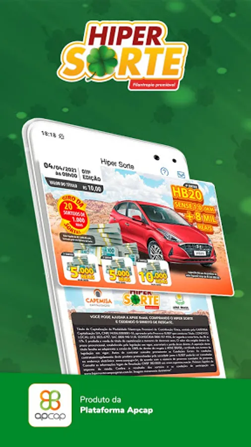 HIPER SORTE is a Single Contribution Capitalization Bond, of the Award Philanthropy Modality, operating in Paraná, approved by SUSEP and issued by Capemisa Capitalização S/A (CNPJ nº 14.056.028/0001-55). In addition to providing the subscriber with the right to participate in sweepstakes, with HIPER SORTE you can contribute to the development and funding of APAE Brasil, through the assignment of the right to redeem your Security, generating resources that will be invested in the provision of assistance services in the various activities of the institution. Learn more about APAE Brasil's work and projects on the website: www.apaebrasil.org.br.