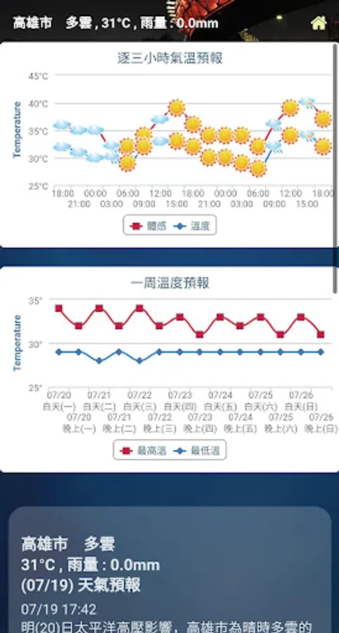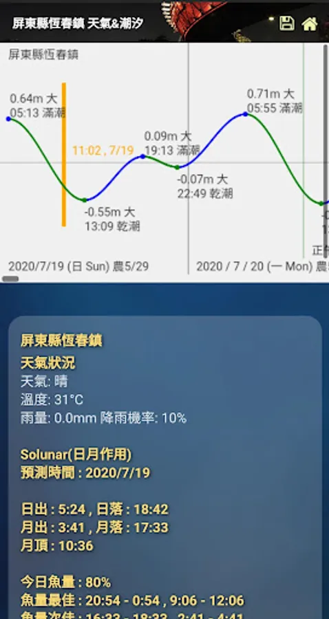 This APP will provide real-time weather information according to geographic location, and display weather conditions, wind, rainfall, tide forecasts, sunrise and sunset times, saving you the time to search and find the catalog, as long as you open the APP, you can get the current location Weather and tide conditions.