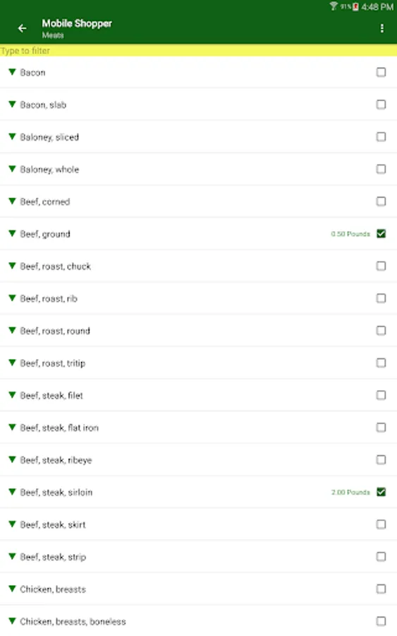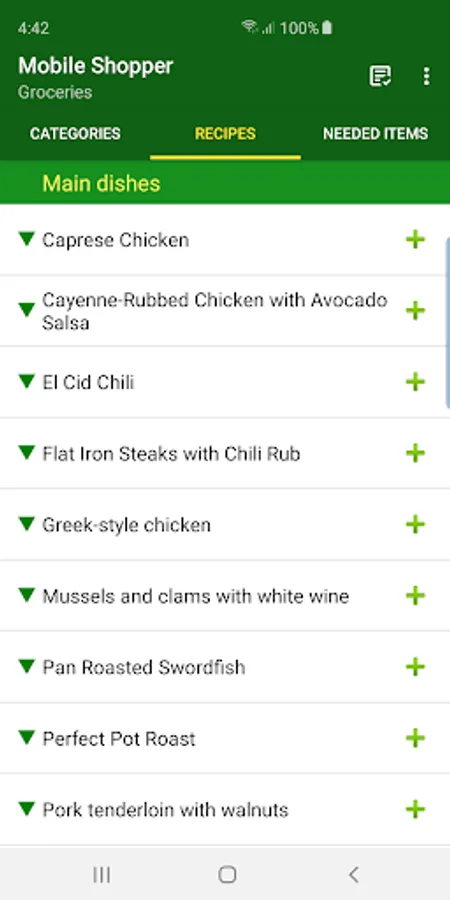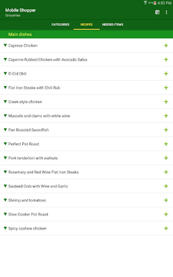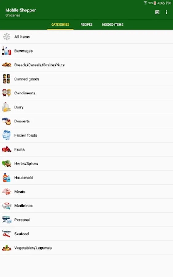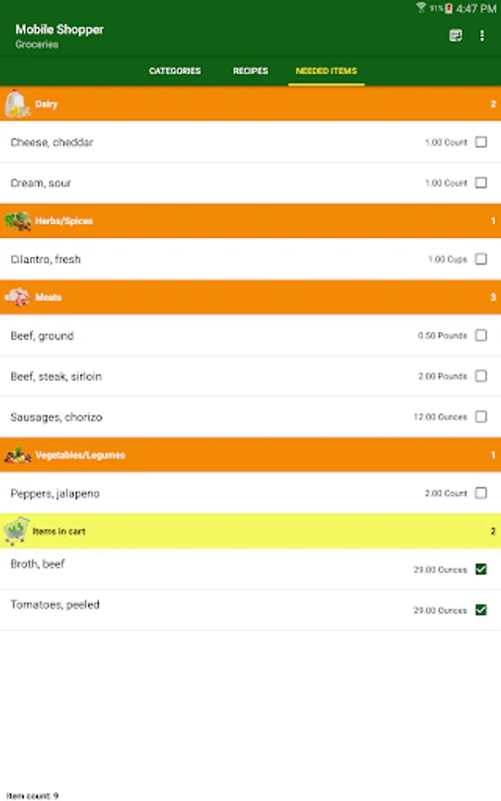 • Items checked off as “Needed” are placed in a separate tab so you can see what you need to buy at the store in one glance.
