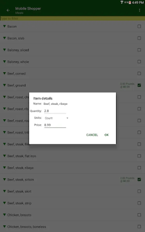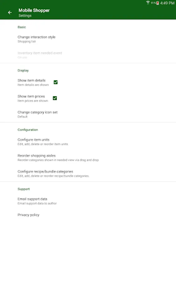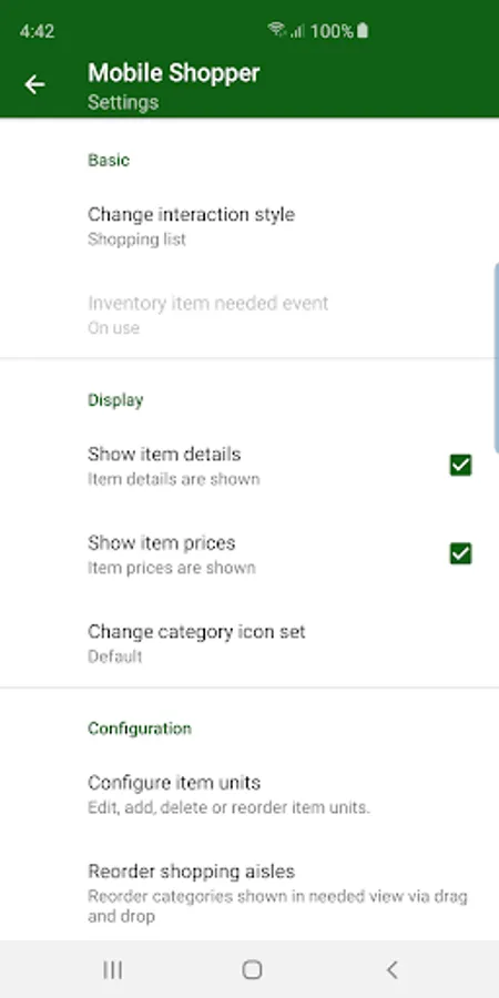 • The app can be configured as a regular shopping list or as an inventory. As an inventory, you record quantities in stock, mark an item as used, and then it appears in the needed list when out of stock.