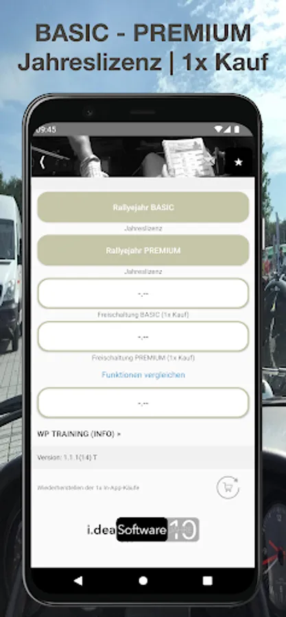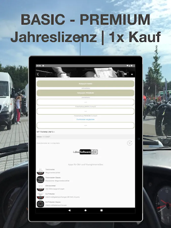 *Activate Basic or Premium feature optionally as yearly subscription or one time in-app purchase . A subscription renews automatically. It can be canceled at any time in the Play Store. Learn more, visit Terms of use https://play.google.com/about/play-terms/ and Privacy https://www.ideasoftware-apps.de/Kontakt for more info.