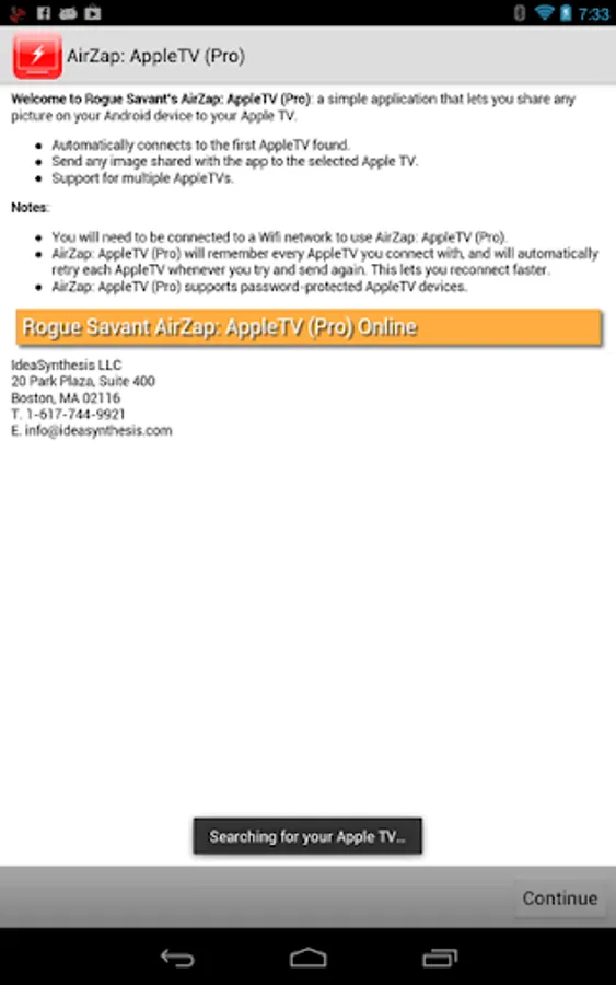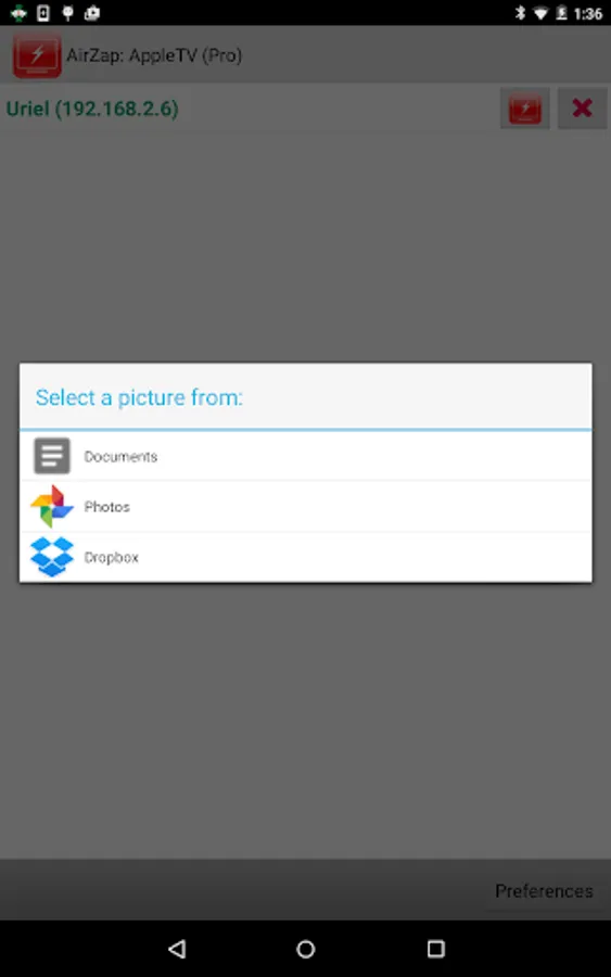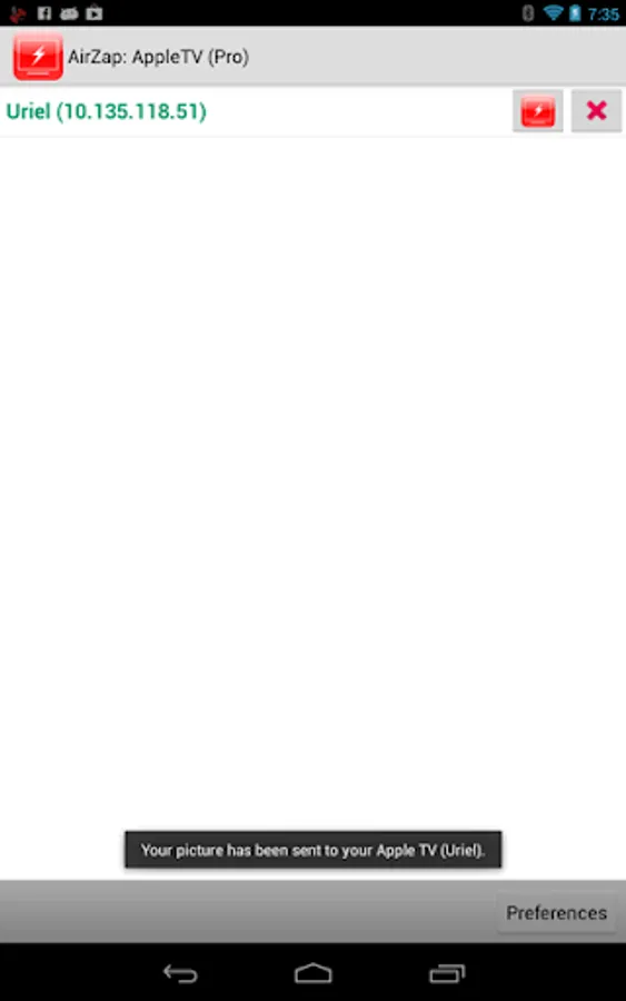 AirZap: AppleTV makes it truly simple to send any picture you're looking at on your Android phone or tablet to your AppleTV device: see your pictures come to life on your big-screen TV that is connected to your Apple TV.