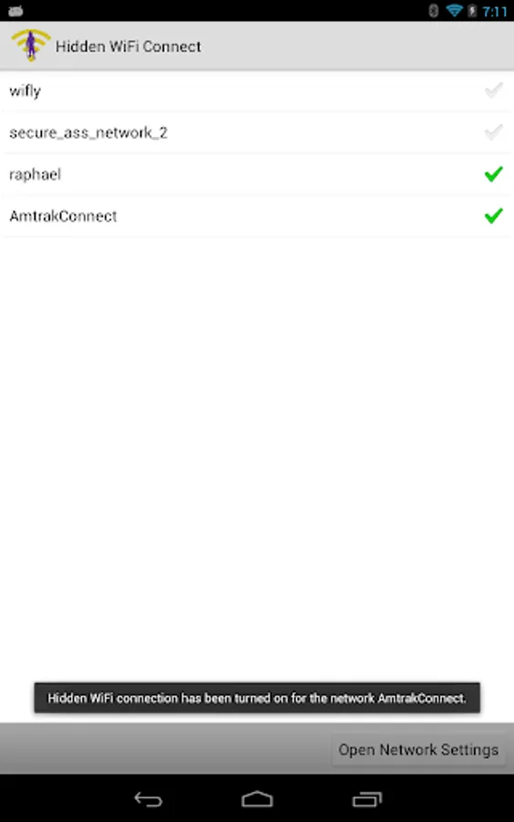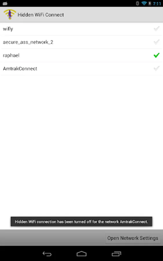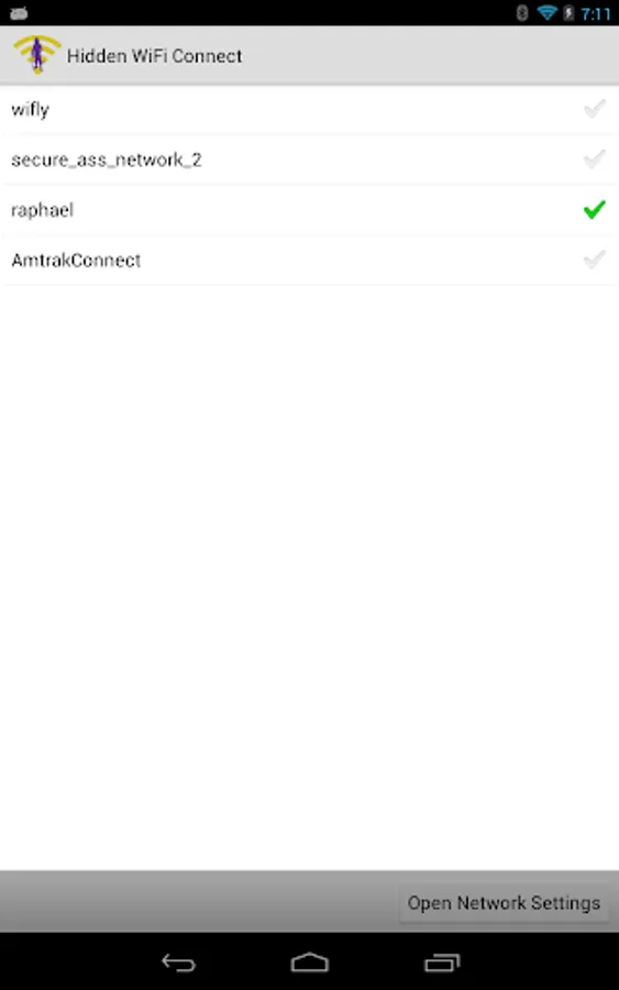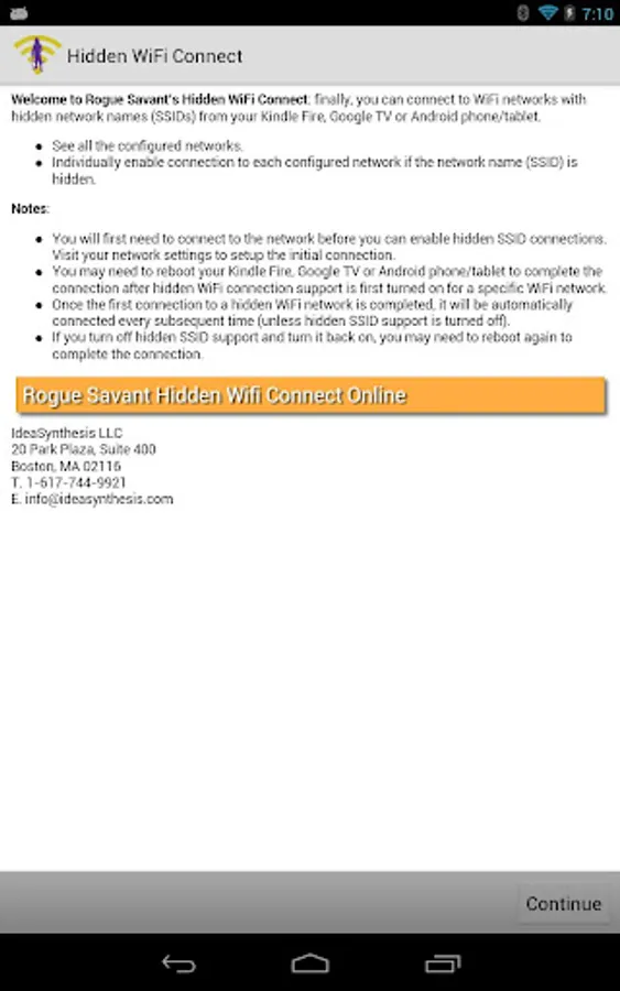 Hidden WiFi Connect makes it easy to connect your Kindle Fire tablet, Google TV or Android phone or tablet to hidden WiFi networks (that do not transmit their WiFi network name or SSID). Finally, you can connect to WiFi networks with hidden network names (SSIDs) from your Kindle Fire, Google TV or Android phone/tablet. See all the configured networks. Individually enable connection to each configured network if the SSID is hidden. Notes: You will first need to connect to the network before you can enable hidden SSID connections. Visit your network settings to setup the initial connection. You may need to reboot your Kindle Fire, Google TV or Android phone/tablet to complete the connection after hidden WiFi connection support is first turned on for a specific WiFi network. Once the first connection to a hidden network is completed, it will be automatically connected every subsequent time (unless hidden SSID support is turned off). If you turn off hidden SSID support and turn it back on, you may need to reboot again to complete the connection.