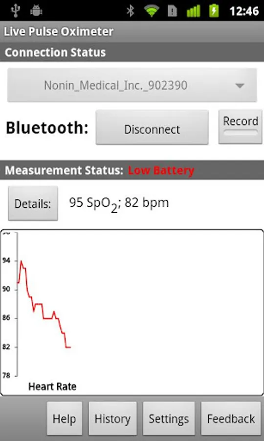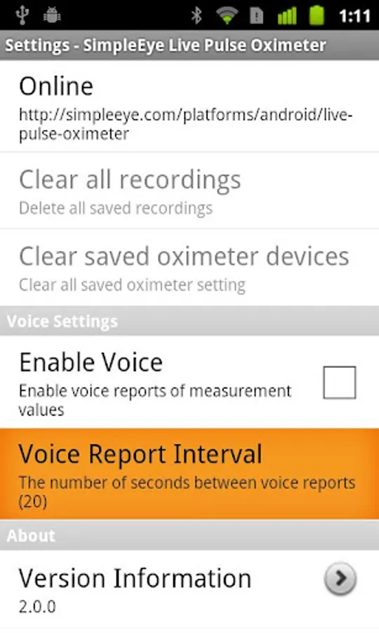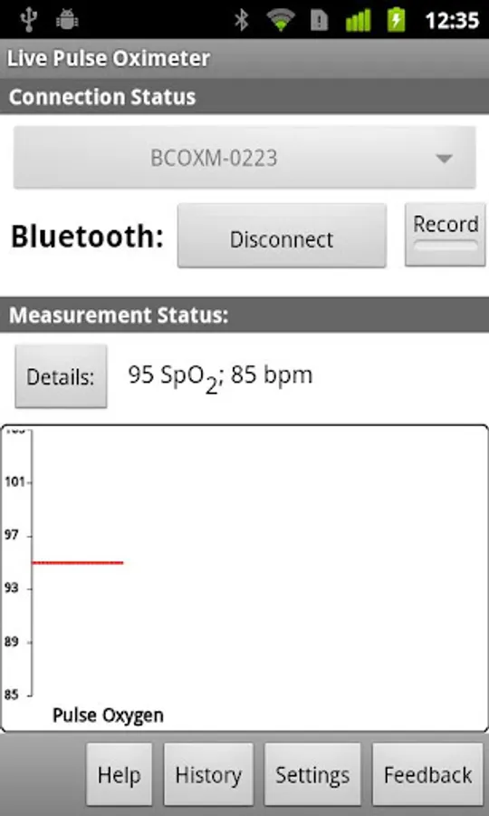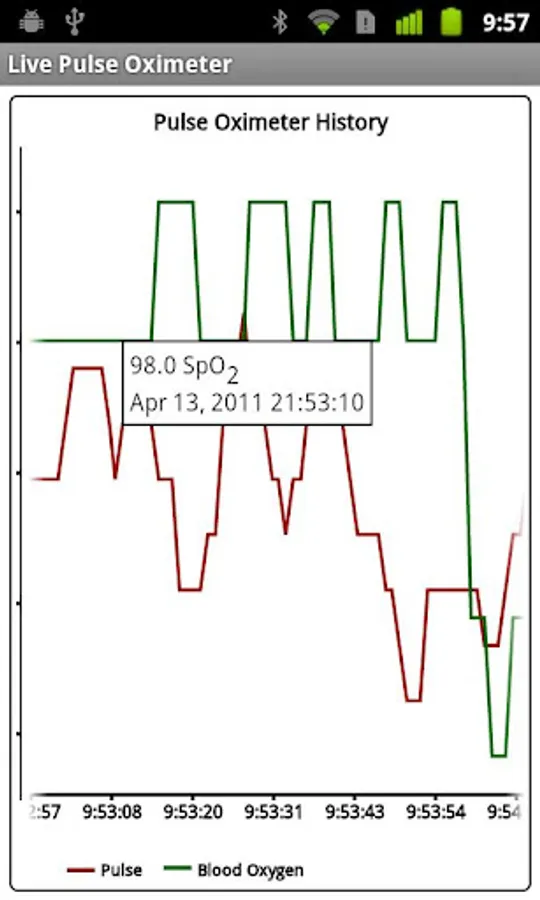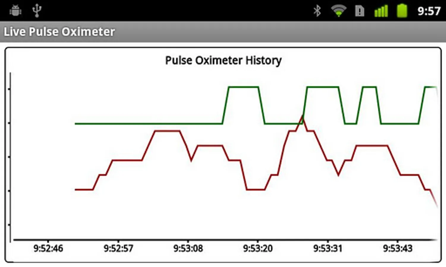 SimpleEye Live Pulse Oximeter displays and records live blood oxygen and heart rate data from a compatible external Bluetooth pulse oximeter. View the last 1, 2 or 5 minutes of live heart rate or blood oxygen data, and create and annotate recordings. Saved recordings can be reviewed in an interactive chart and can be shared using email.