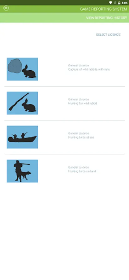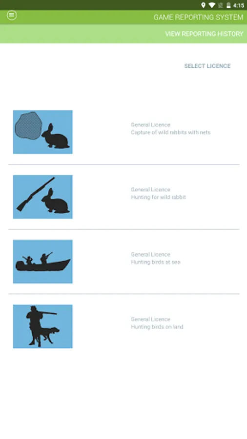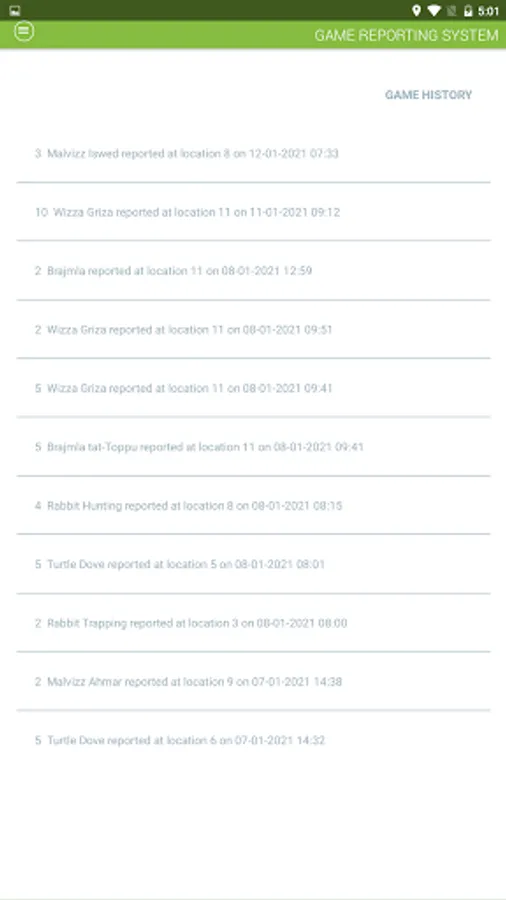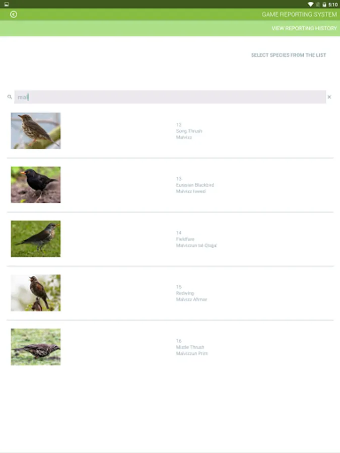 Game Reporting MT hi mezz kif persuna, b’ liċenzja maħruga mit-Taqsima tar- Regolamentazzjoni tal-Għasafar Selvaġġi, tista’ tirraporta qbid ta’ għasafar u fniek. Din l-app tista’ tintuża minflok is-sistema tar-rappurtar telefonika permezz ta’ stampi b’mod iżjed faċli.