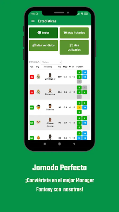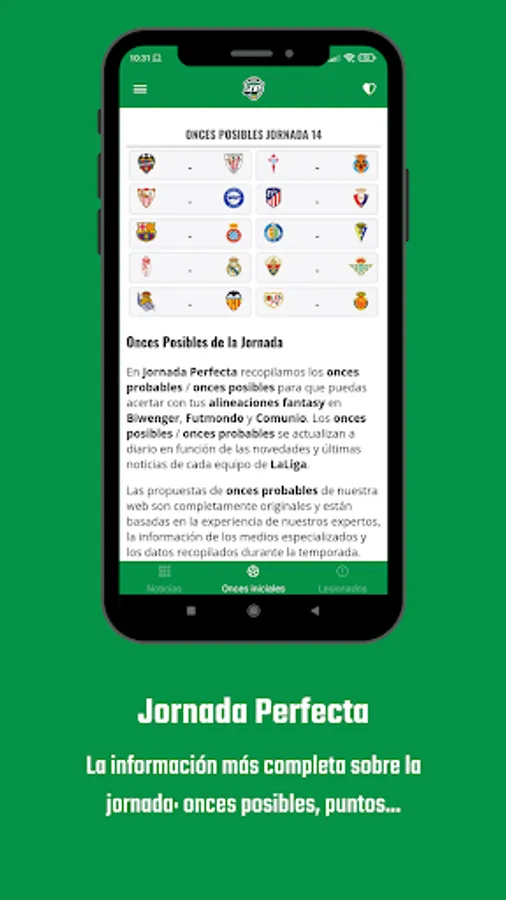 Perfect Day is an app where you find all the information to be the best fantasy manager on platforms like Biwenger, Comunio and Futmondo. The app has a main section with news today and Laliga in key fantasy: analysis of buying and selling, top players, ideal onces, major injuries, etc. In addition, it is complemented by key sections like Onces Possible, Scores, Injured, Sanctioned, Statistics and chroniclers.
