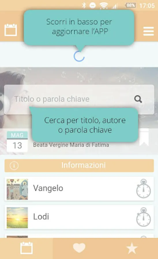 Search the prayers or songs by entering the title or a keyword in the search engine Pregaudio.