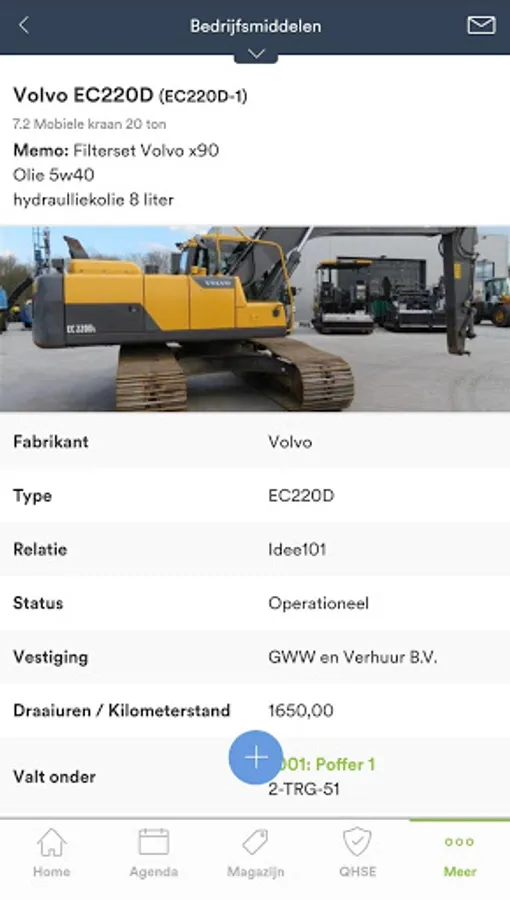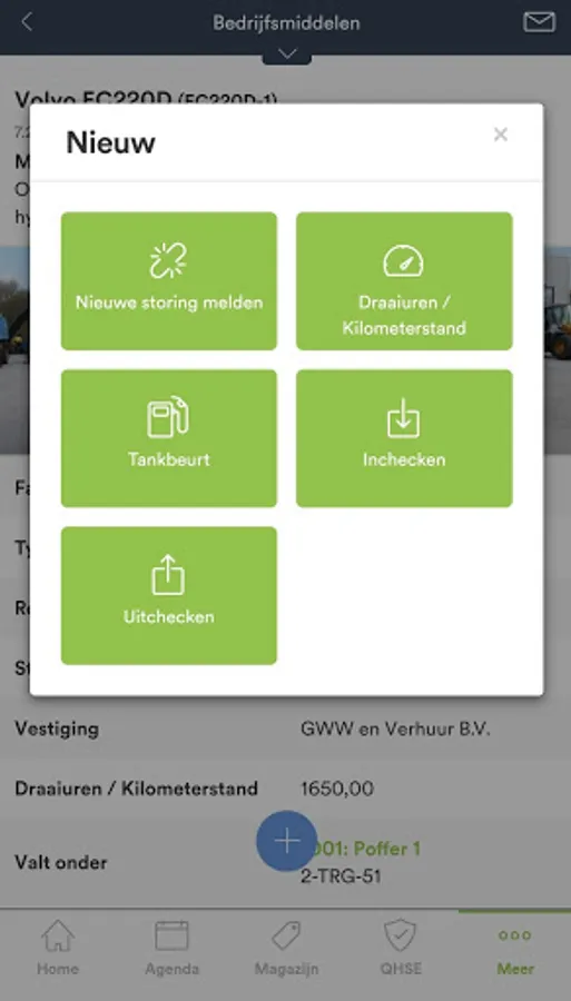There is a clear company resource detail map where the driver or operator can perform his actions such as malfunctions, refueling and updating running hours / km. This detailed map offers space to add more actions and information such as inspections in the future.