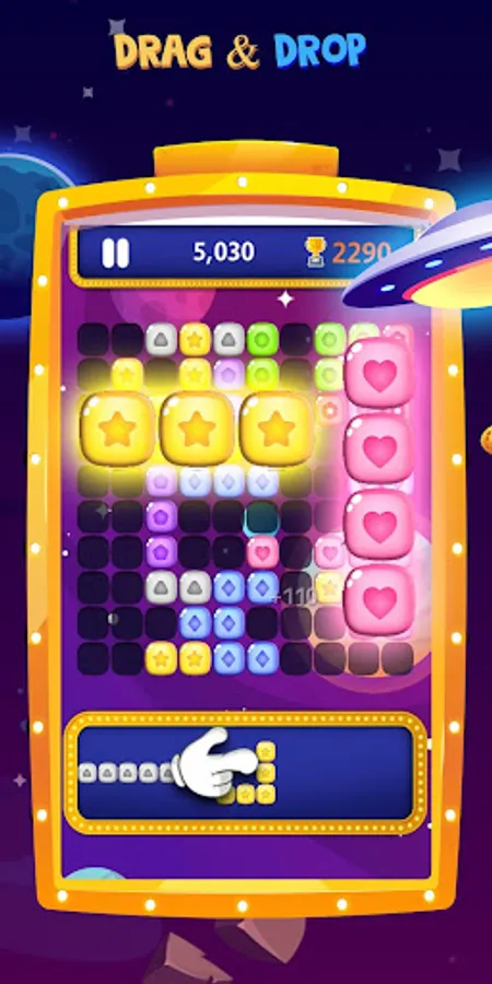 • Drag and drop the blocks into the board. Make lines horizontally or vertically to clear blocks.